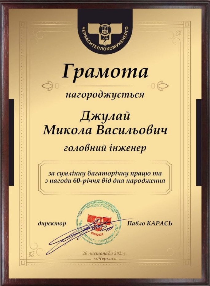 Головного інженера КПТМ «Черкаситеплокомуненерго» Миколу Джулая із 60-річним ювілеєм вітає колектив підприємства!