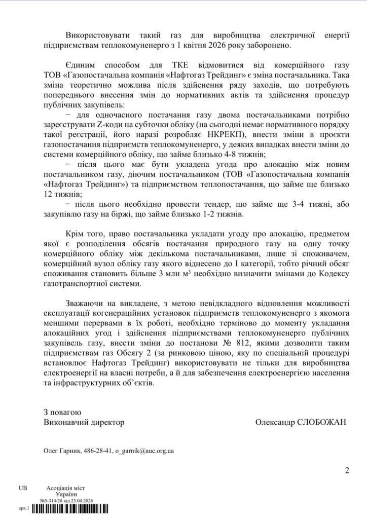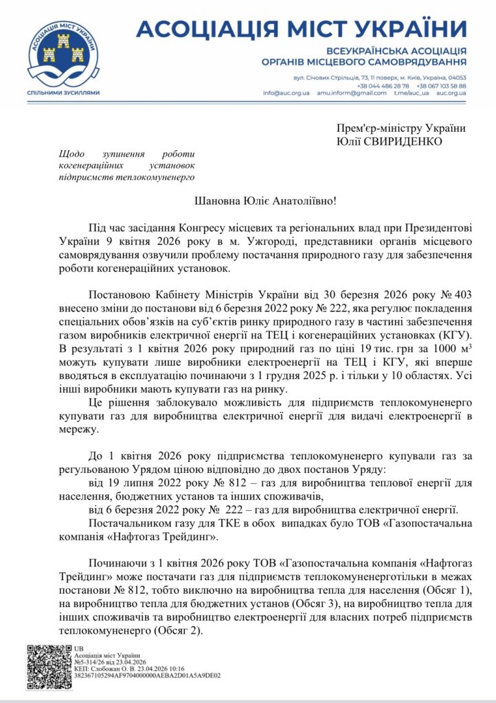 Асоціація міст просить прем’єр-міністра України вирішити питання газопостачання для роботи когенерації